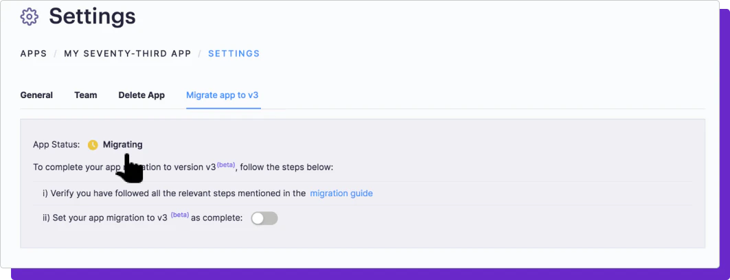 Once you’ve finished making all needed code changes, go to the dashboard and switch on the toggle to mark your app migration to v3 as complete.