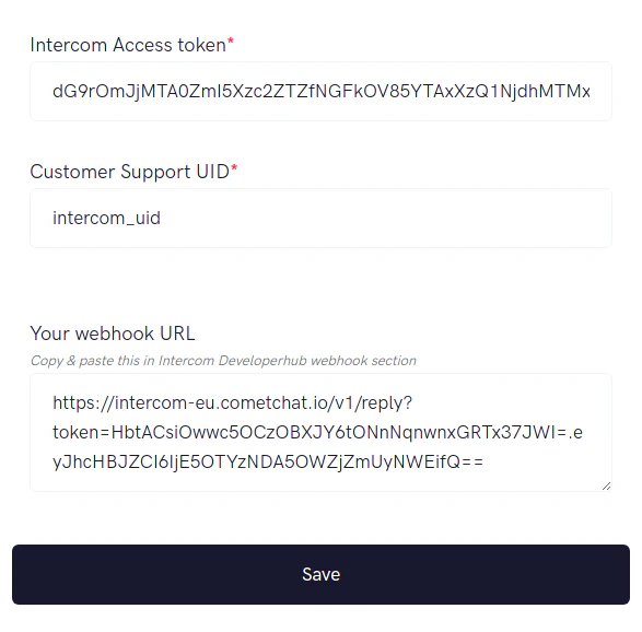 - Intercom Access token: Copied earlier from the Intercom Developer Hub.