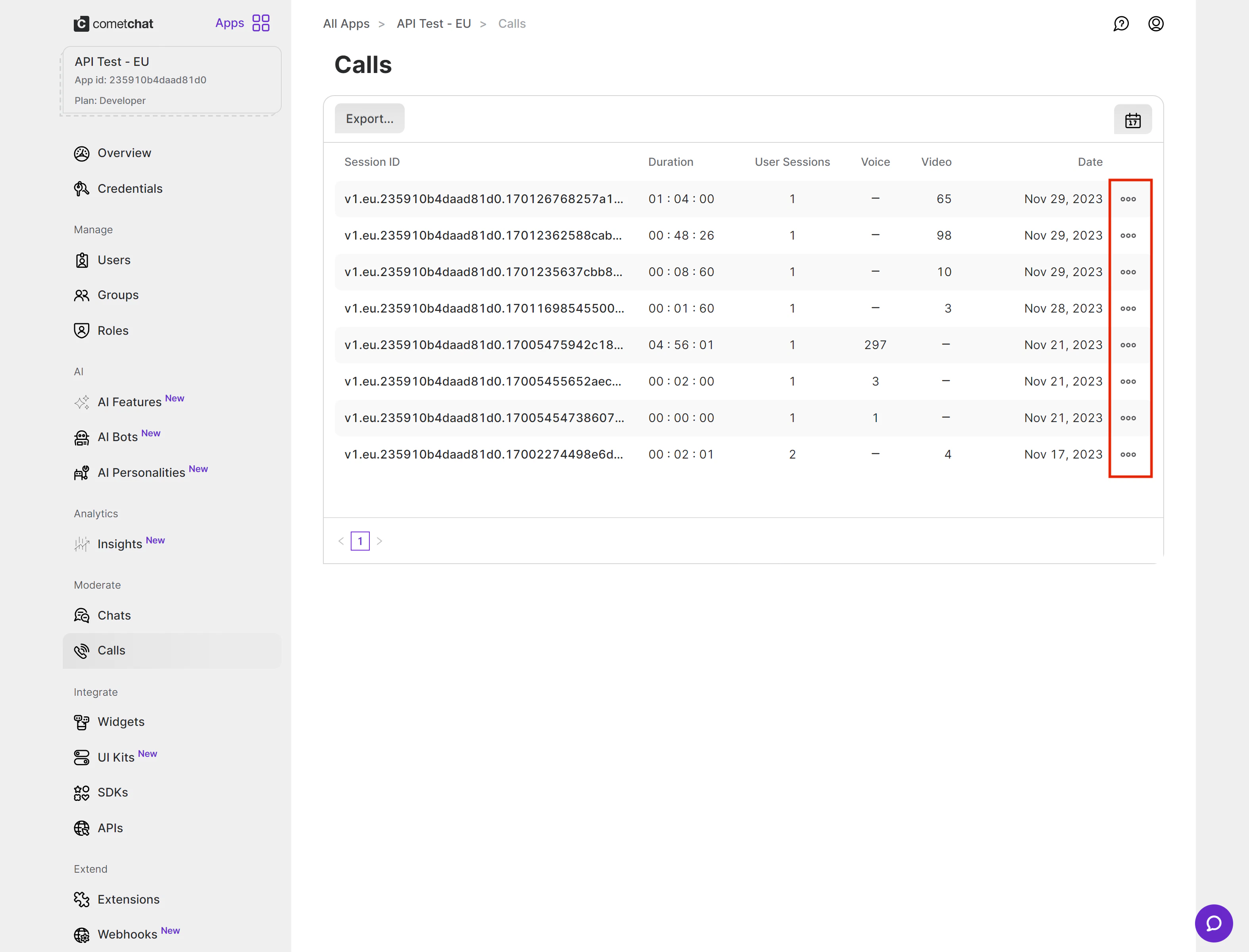 Currently, the call recordings are available on the CometChat Dashboard under the Calls Section. Recordings can be accessed after clicking on the three dots menu icon to expand the menu and then select “View Recordings”. You can refer to the below screenshot. You can refer to the below screenshot.