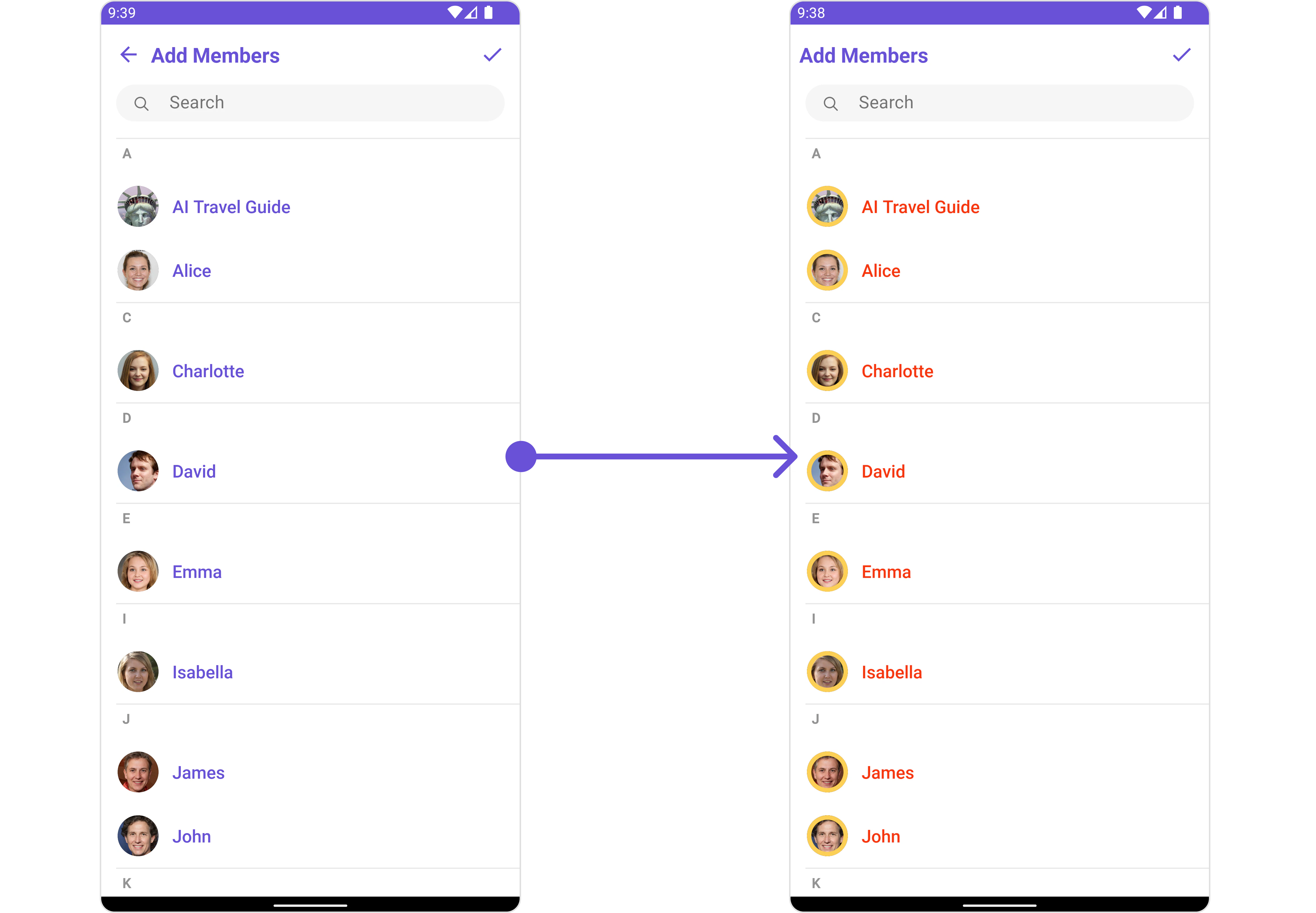 All exposed properties of AddMembersConfiguration can be found under Add Members. Properties marked with the 🛑 symbol are not accessible within the Configuration Object. Example Let’s say you want to change the style of the Add Members subcomponent and, in addition, you only want to show the back button. You can modify the style using the ListItemStyle property and AvatarStyle property