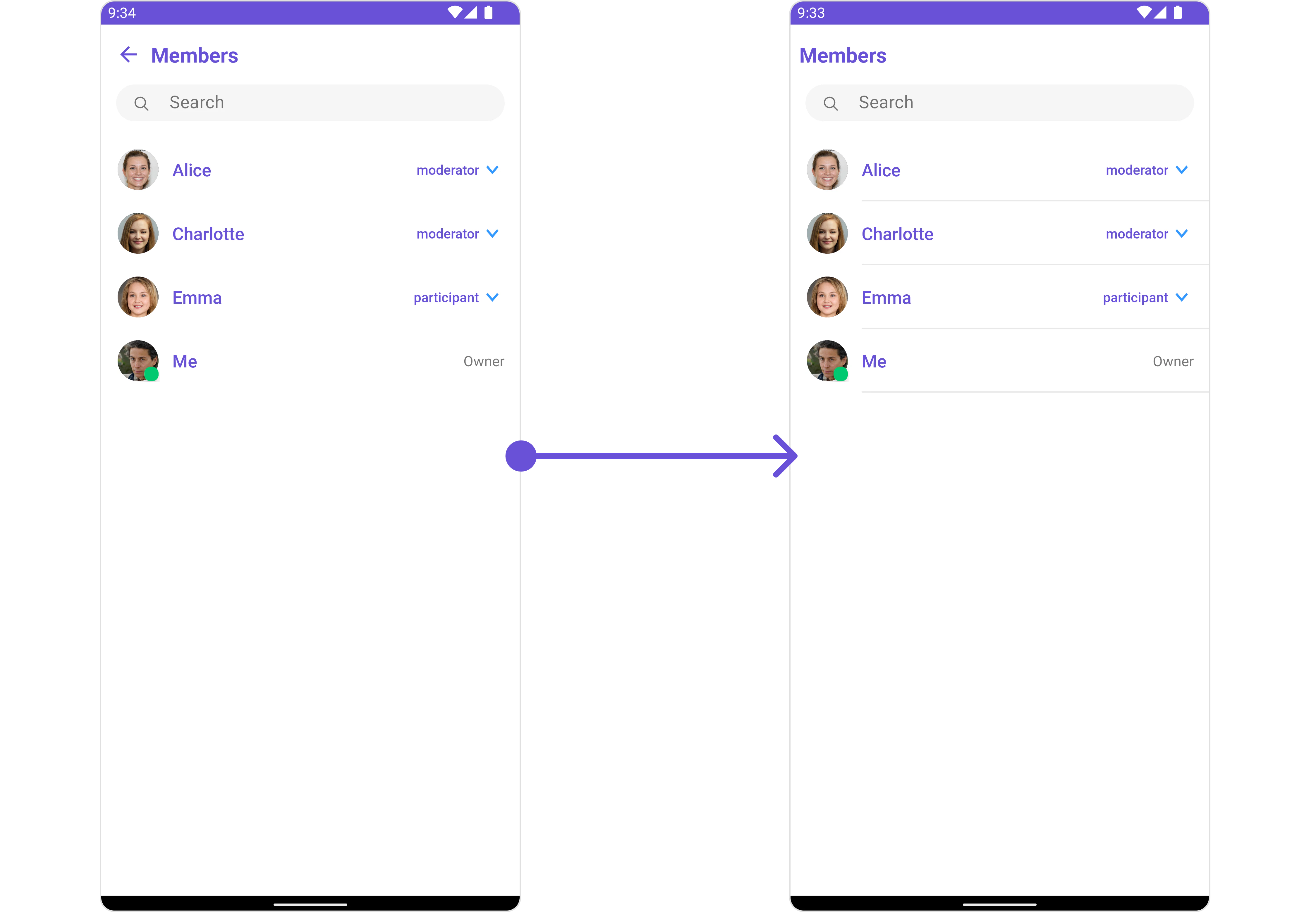 All exposed properties of GroupMembersConfiguration can be found under Group Members. Properties marked with the 🛑 symbol are not accessible within the Configuration Object. Example Let’s say you want to change the style of the Group Member subcomponent and, in addition, you only want to hide separator and show back button. You can modify the style using the groupMembersStyle property, hide the separator using setHideSeparator() property and show back button using setShowBackButton() property.