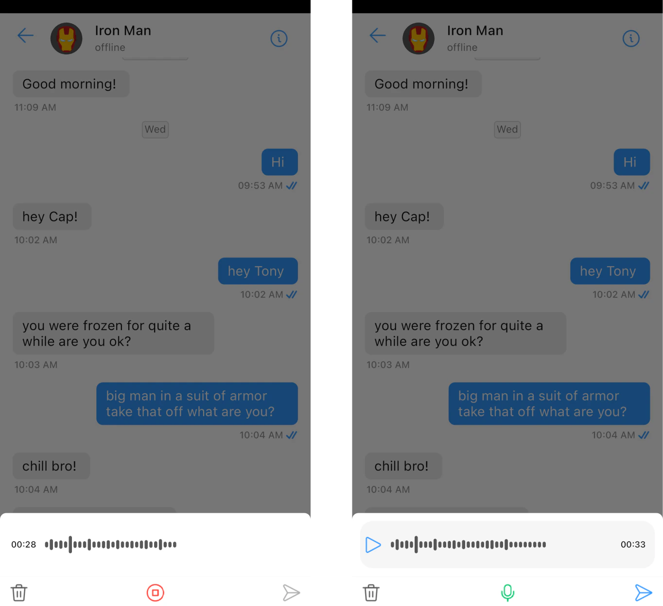 | submitIcon | Widget | provides icon to the start Icon/widget that utilizes the path audio recorded through the CometChatMediaRecorder |