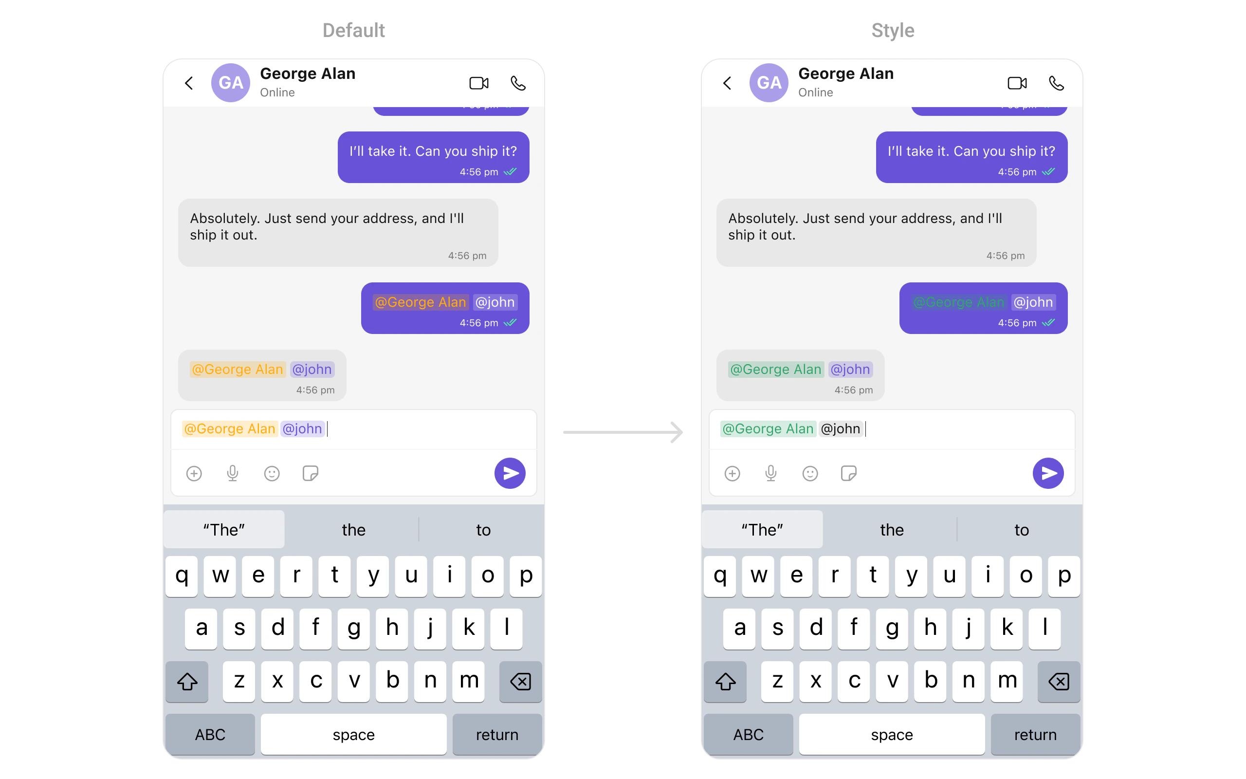 | Set composerTextStyle | Sets styling for composer’s formatted text | MentionTextStyle |