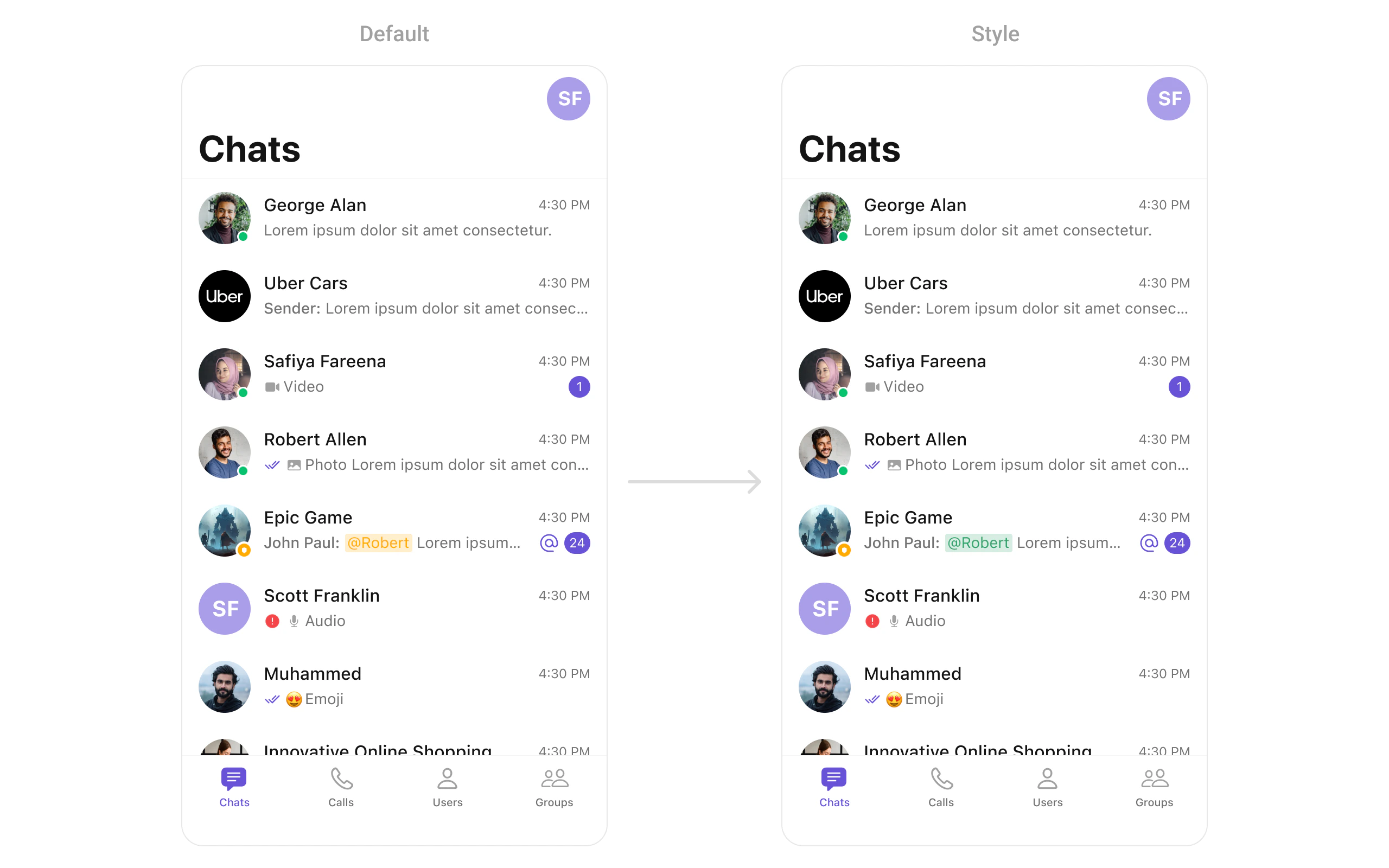 .set(leftBubbleTextStyle),.set(rightBubbleTextStyle),.set(composerTextStyle), and.set(conversationListTextStyle)methods to format text messages with mentions appropriately for display in the chat interface. - Customization: Customize the appearance and behavior of mentions by adjusting the text styles, colors, and other formatting properties as needed.