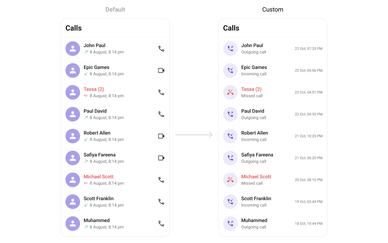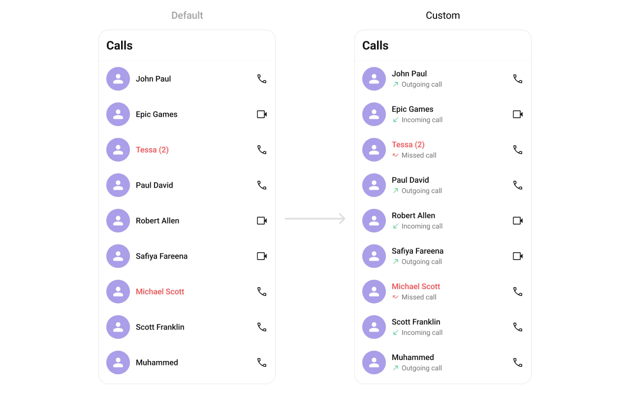 CometChatCallLogs is a Component that shows the list of Call Logs available. By default, names are shown for all listed users, along with their avatars if available.