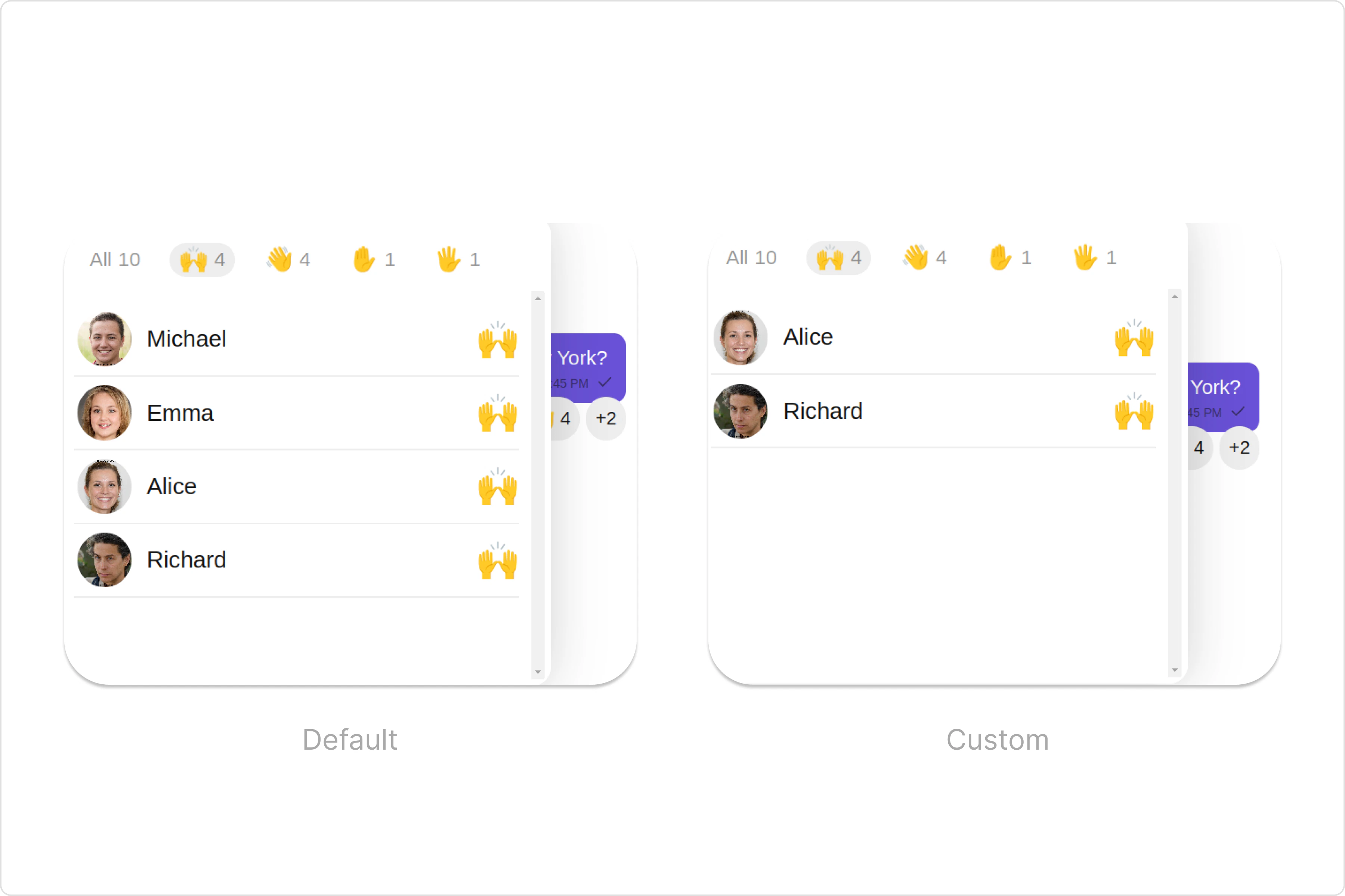 To fit your app’s design requirements, you can customize the appearance of the Reaction List component. We provide exposed methods that allow you to modify the experience and behavior according to your specific needs.