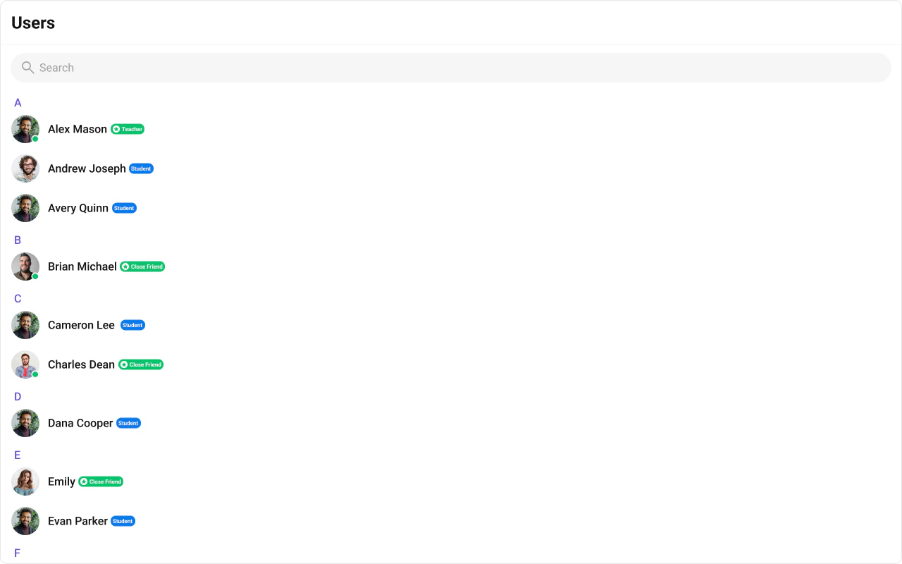 Show Section HeaderDisplays an alphabetical section header for the user list.showSectionHeader={true}