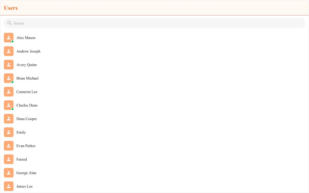 The Users is a Component, showcasing an accessible list of all available users. It provides an integral search functionality, allowing you to locate any specific user swiftly and easily. For each user listed, the widget displays the user’s name by default, in conjunction with their avatar when available. Furthermore, it includes a status indicator, visually informing you whether a user is currently online or offline.